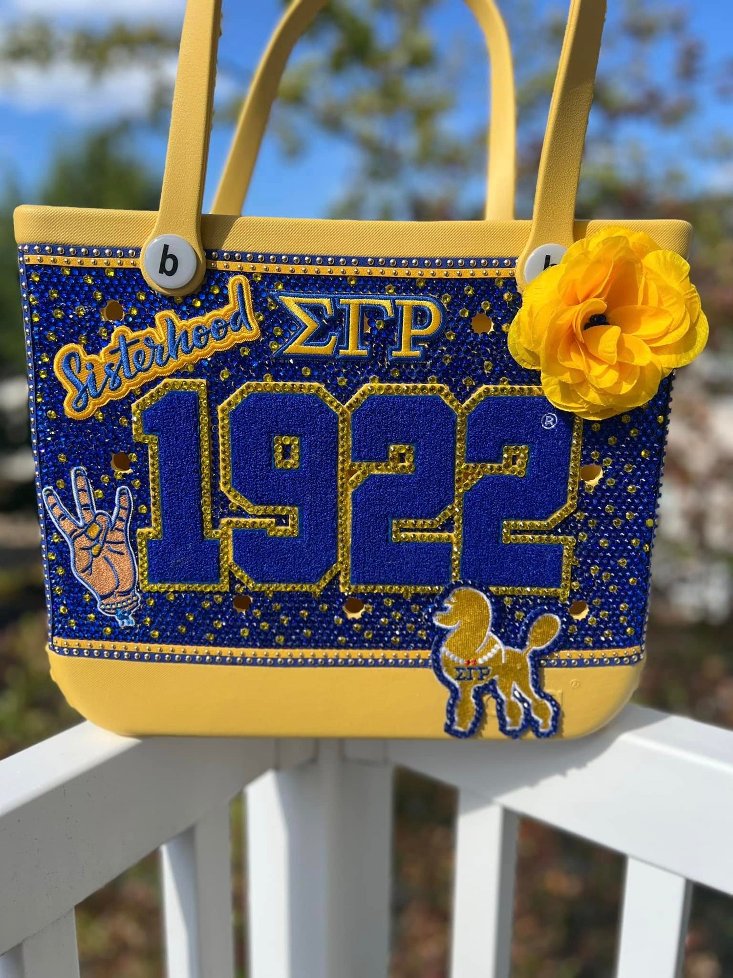 Step out in style and RHOyal sparkle with this custom SGRHO Blinged Bag! Available in small or medium sizes (large available upon special request), each bag is uniquely handcrafted and features one side adorned with sparkling rhinestones, vibrant patches, and custom embellishments that reflect your individual flair and sorority pride.
