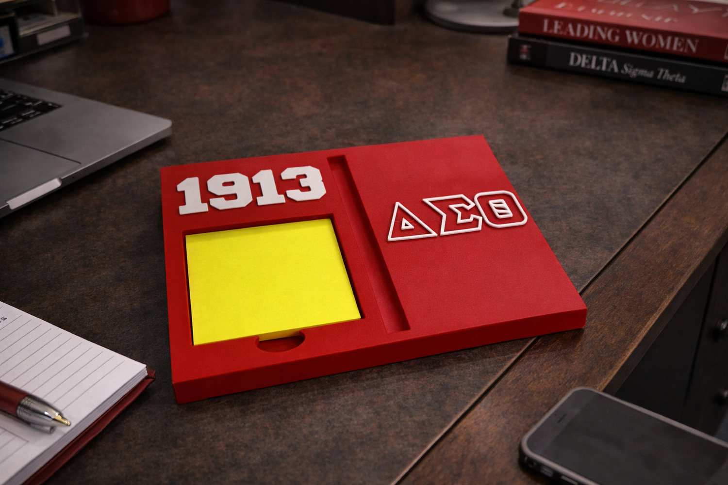 Each holder is 3D printed using durable PLA plastic, offering a lightweight yet sturdy design made to hold standard sticky note pads. Featuring the founding year 1913 and classic Delta Sigma Theta lettering, it’s a standout piece that celebrates sisterhood and excellence.